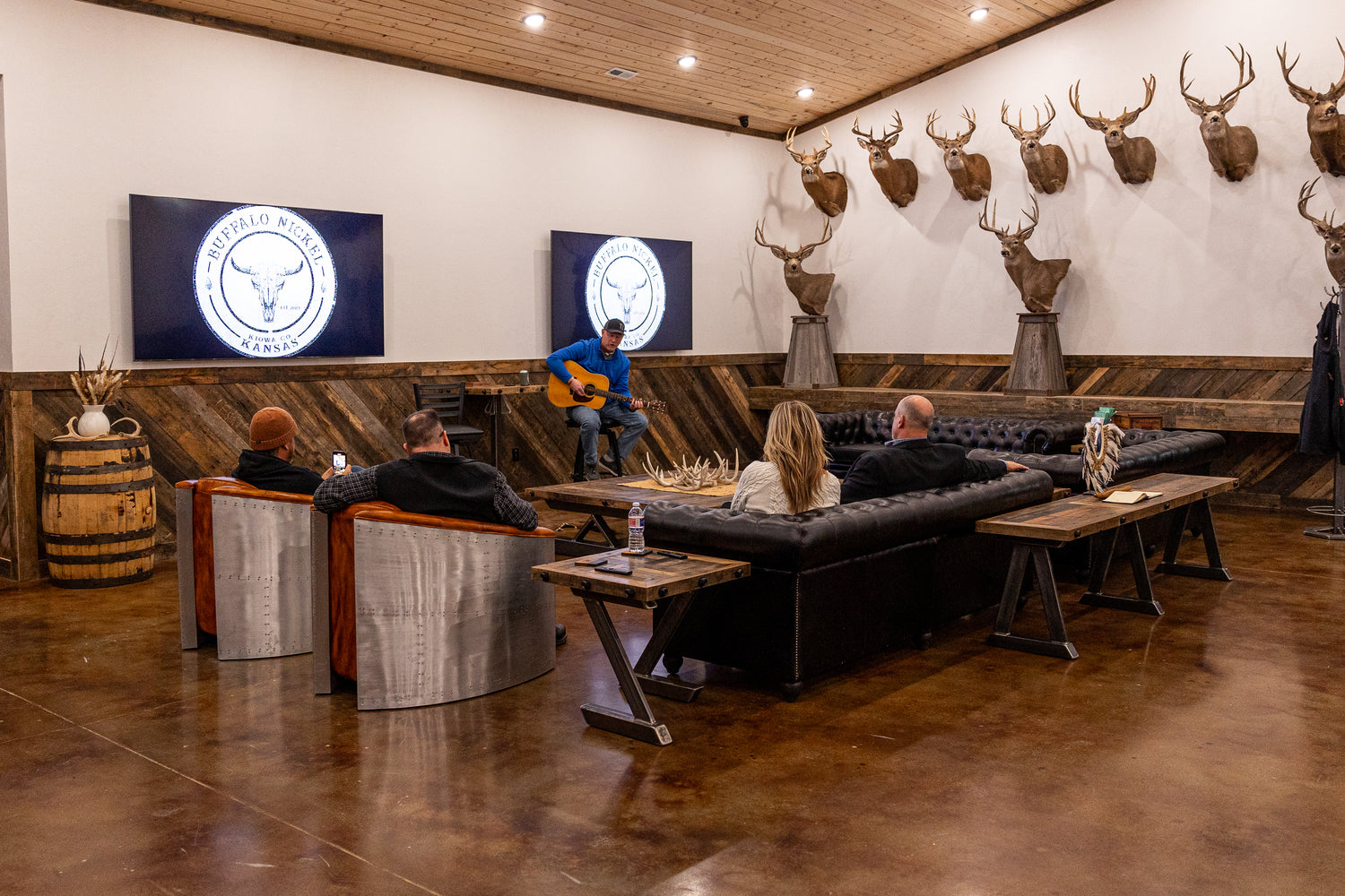 Our great room is perfect for any event. It features two custom-made dining tables that seat many guests, a comfortable sitting area with TVs, and a 30-foot bar to accommodate everyone.